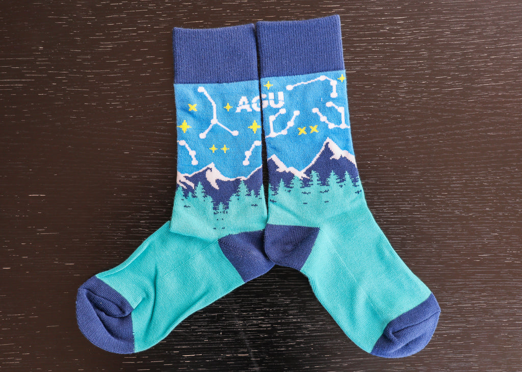 These custom AGU socks feature constellations on a night sky above a landscape of mountains and pine trees, in hues of blue, green and yellow. One size fits all.